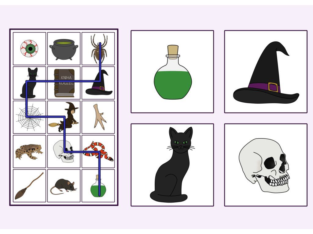 Pohybová hra s obrázky oblíbených věcí a zvířat každé čarodějnice, která děti přirozeně rozhýbe a procvičí jejich orientaci v prostoru. Úkolem je projít vyznačenou trasu a dostat se na druhou stranu.