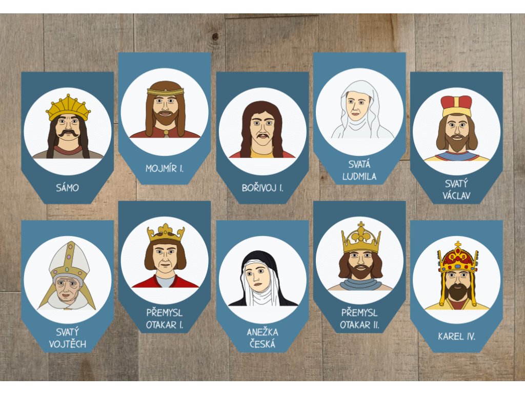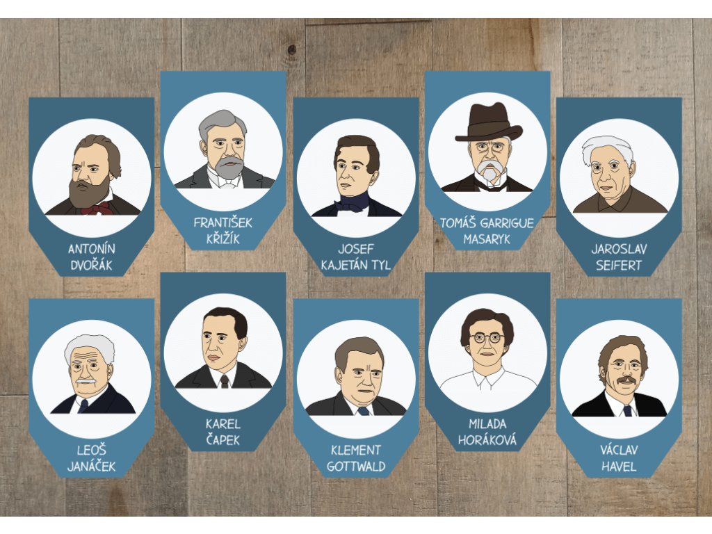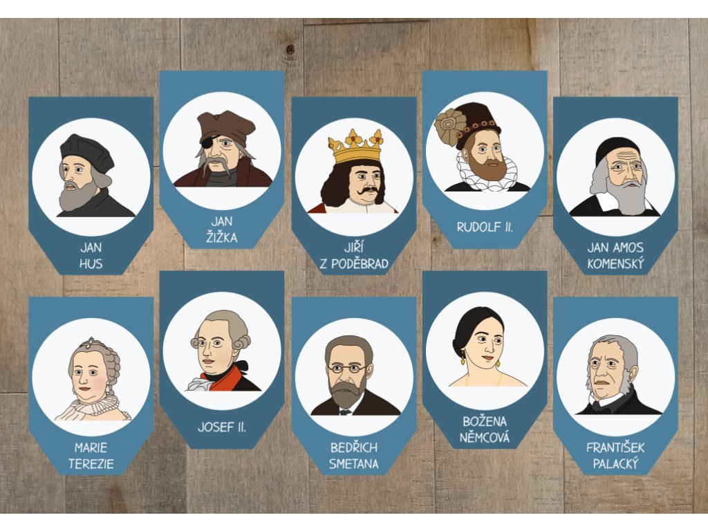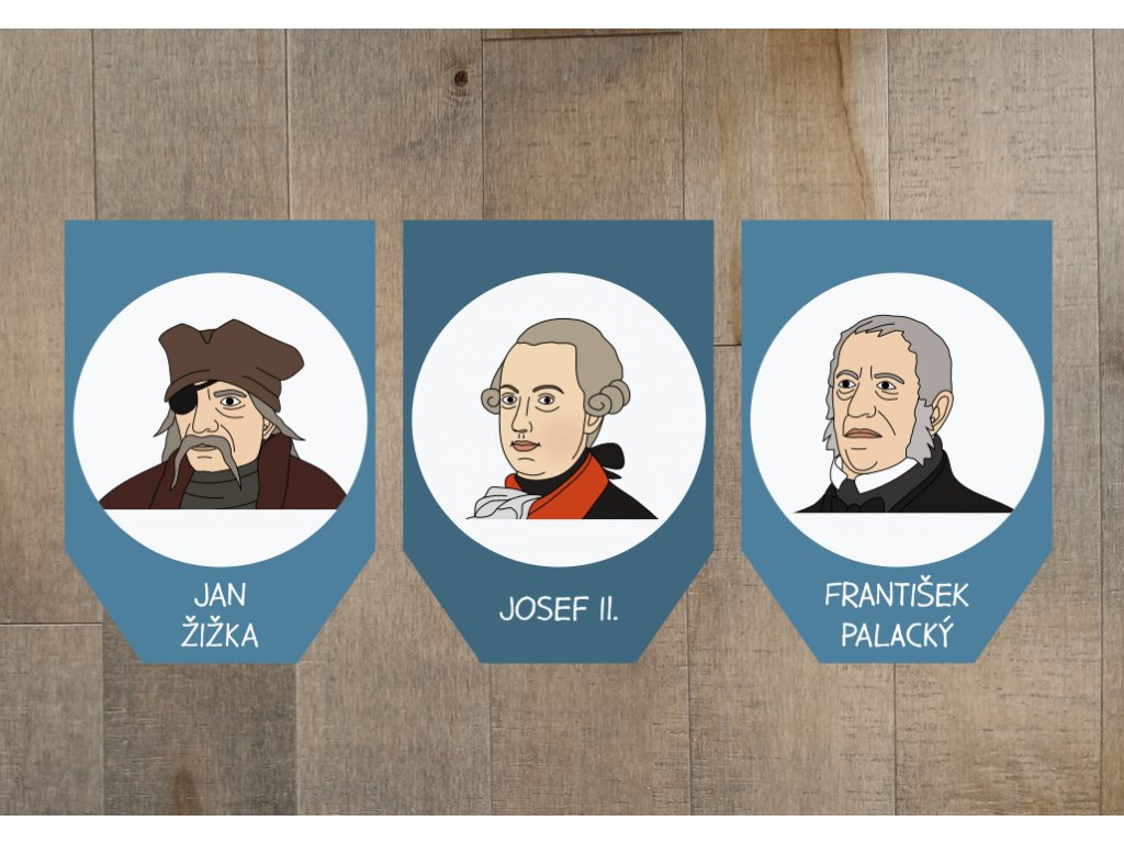 Soubor obsahuje 30 vlaječek formátu A4, na nichž najdete ilustrace osobností naší historie od Sáma až po Václava Havla. Díky snadné přípravě zabere výroba jen pár minut a výsledek stojí za to. Děti se díky ilustracím snadno seznámí s významnými osobnostmi a přirozeně si zapamatují jejich jména.