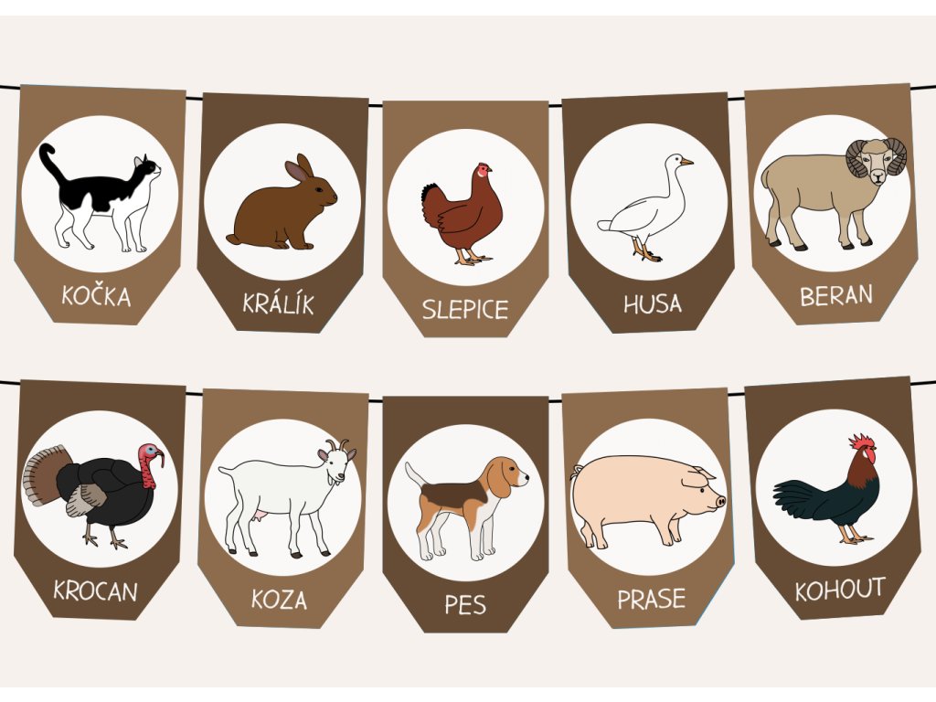 Soubor obsahuje 25 vlaječek formátu A4, na nichž najdete ilustrace domácích zvířat. Díky snadné přípravě zabere výroba jen pár minut a výsledek stojí za to. Děti si obrázky rády prohlížejí a zároveň si tak nenápadně procvičí názvy zvířátek.