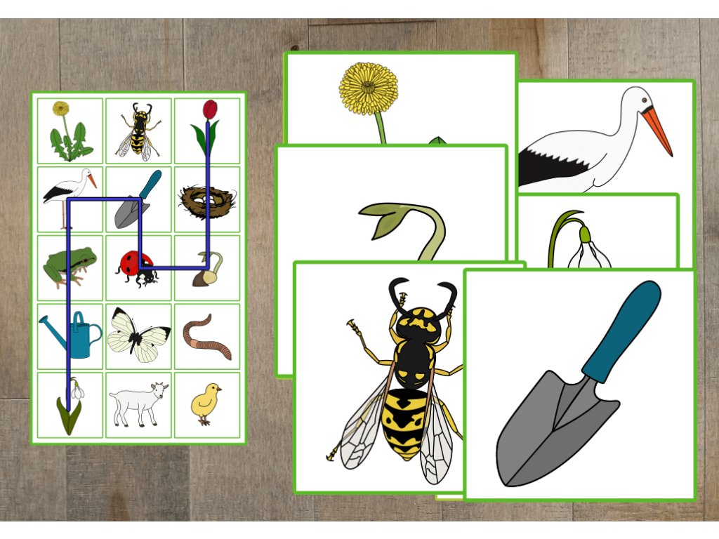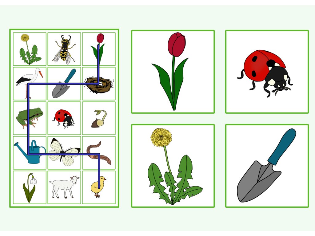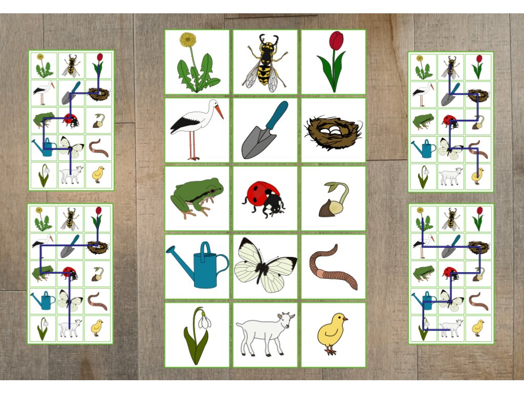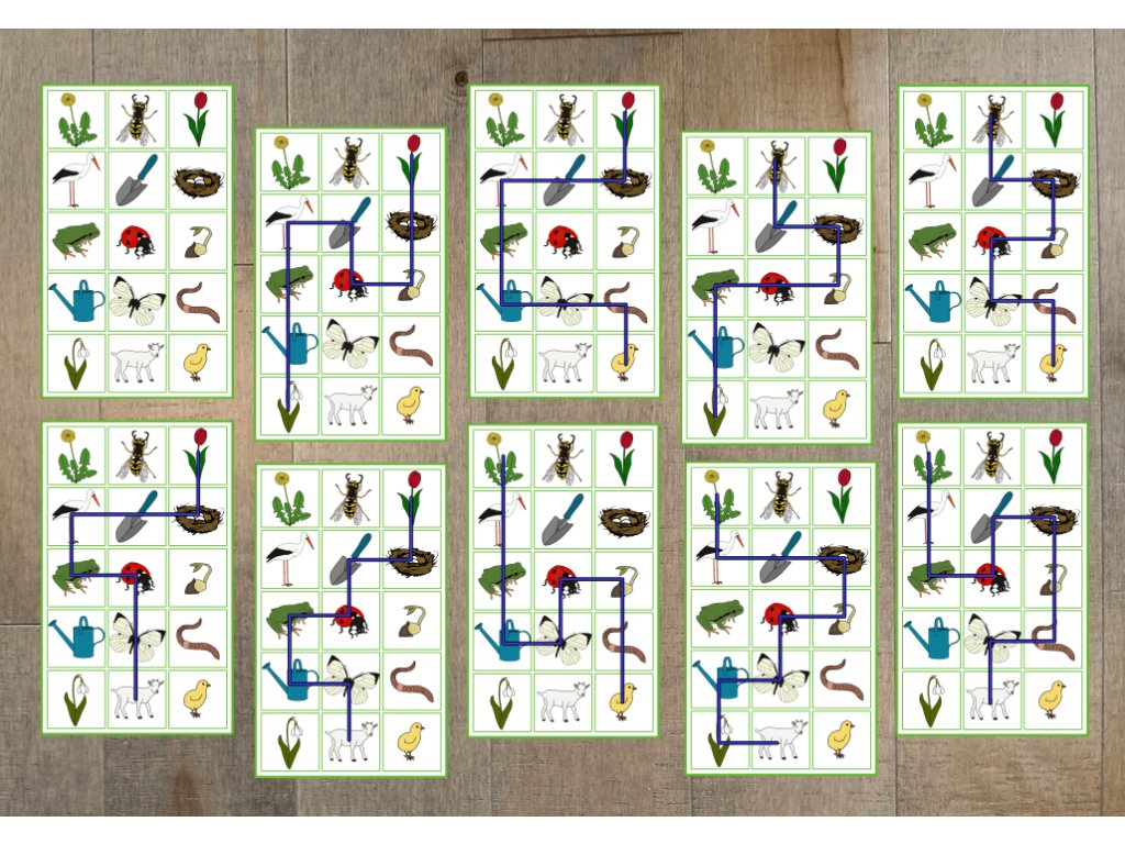 Soubor obsahuje 15 velkých obrázků (20 × 20 cm), 9 předlohových karet s cestičkou a 1 prázdnou kartu pro vlastní trasu. Hru můžete obměňovat zadáváním slovních pokynů (doprava, doleva, dopředu, dozadu) nebo určovat konkrétní obrázky, po kterých mají děti postupovat. Obrázky lze využít i jako demonstrační kartičky k tématu.