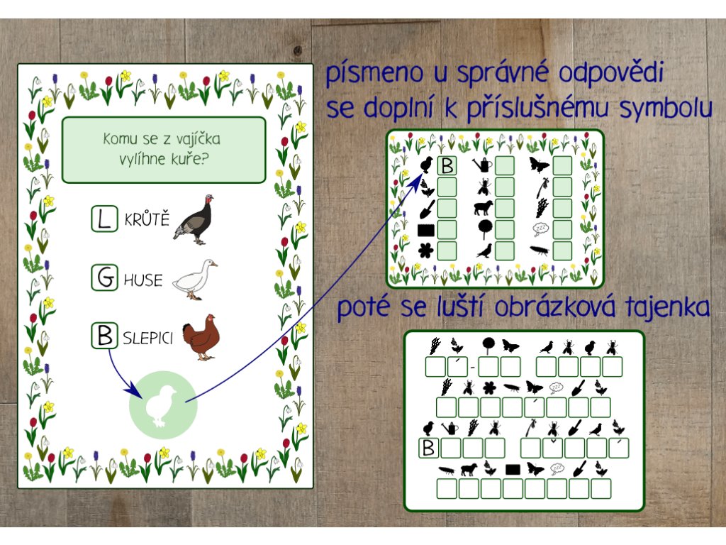 Hra obsahuje 15 listů s otázkami. Písmeno u správné odpovědi děti doplní do šifrovací kartičky a na konci vyluští tajenku.