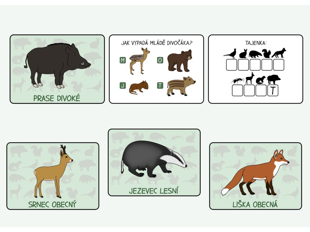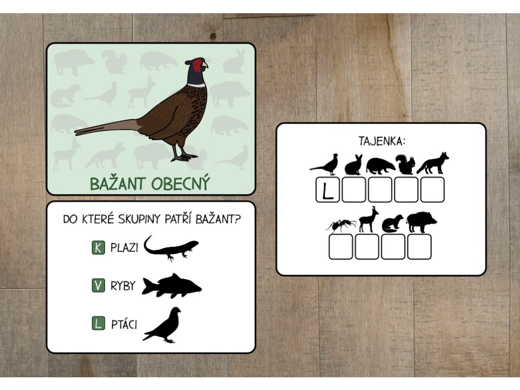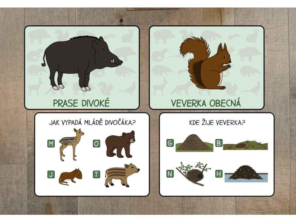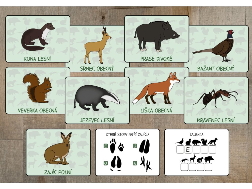Hra obsahuje 9 karet s obrázky zvířat, kdy na druhé straně jsou otázky či úkoly. Písmeno, které je u správné odpovědi děti napíší k příslušnému stínu zvířete do šifrovací karty. Po vyplnění všech písmen přečtou obrázkovou tajenku, která zní "lesní svět".