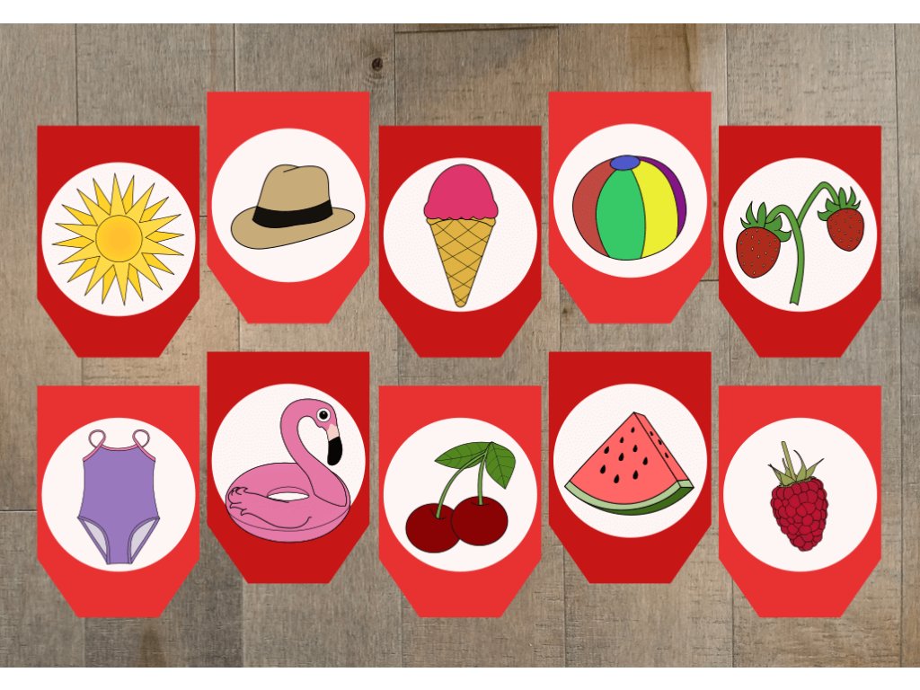 Soubor obsahuje 25 vlaječek formátu A4, na nichž najdete ilustrace spojené s letním obdobím. Díky snadné přípravě zabere výroba jen pár minut a výsledek stojí za to. Děti si obrázky rády prohlížejí a zároveň se tak nenápadně naladí na letní témata.