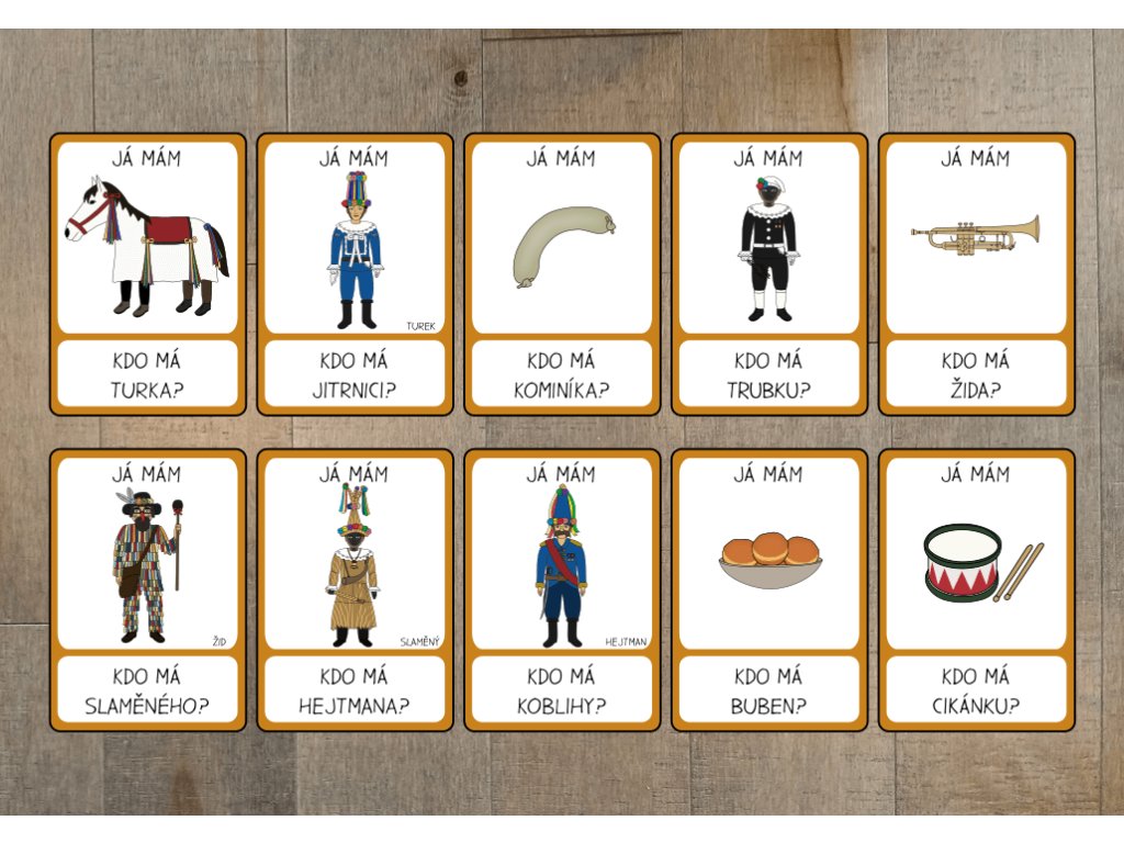Obsahem je 21 oboustranných hracích karet plných krásných kreslených obrázků, které přibližují atmosféru masopustu. Navíc zde najdete přehledovou kartu, na které jsou uvedeny všechny názvy obrázků, což usnadní orientaci při hře.