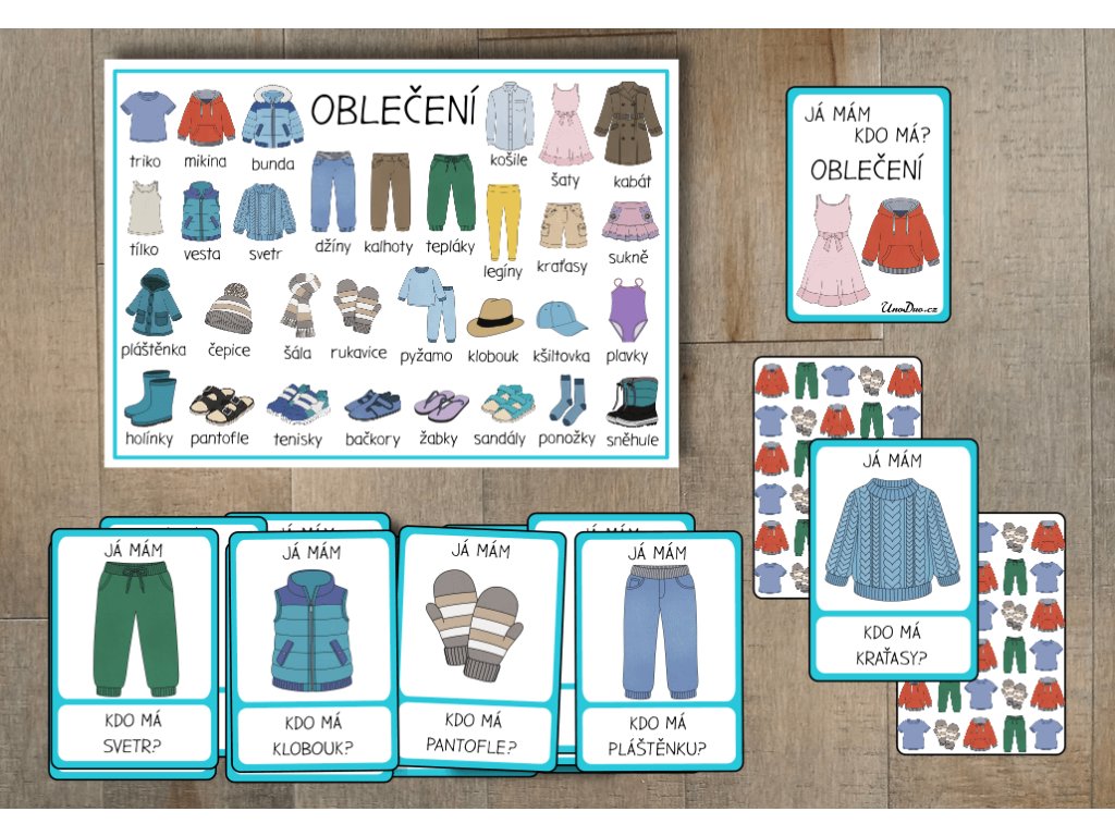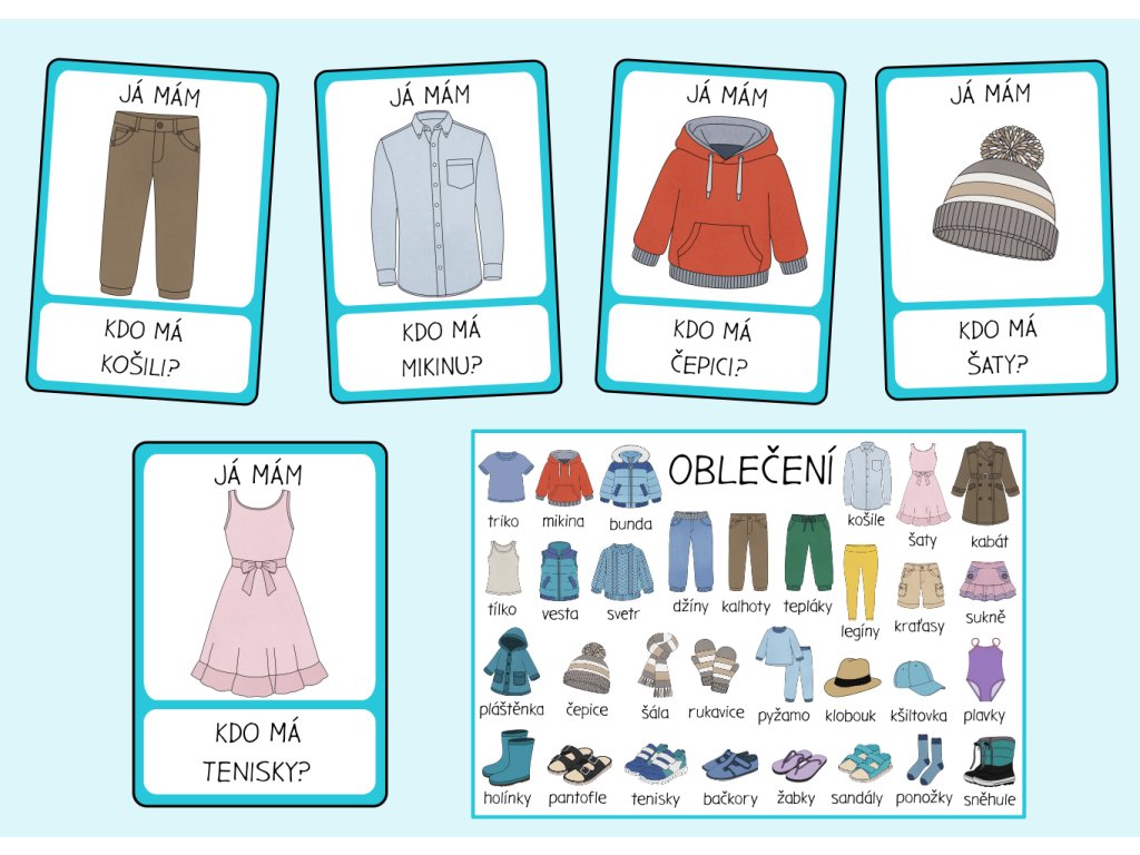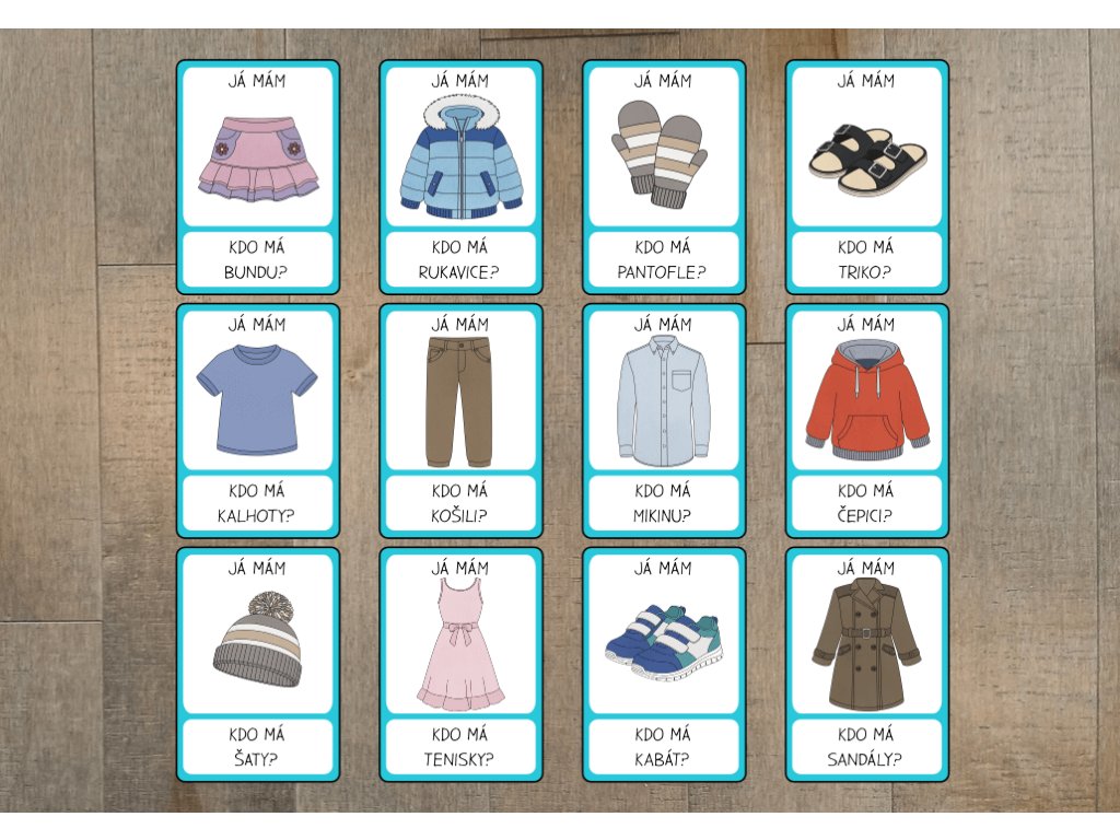 Rozdáme karty mezi děti (někdo může mít více). Zvolíme začínajícího hráče, který přečte spodní část libovolné karty - např. "Kdo má košili?" Ozve se hráč, který má v horní části obrázek daného oblečení "Já mám košili" a zeptá se na oblečení ve spodní části své karty "Kdo má mikinu?" Takto pokračujeme dále do doby, kdy se někdo zeptá na oblečení z horní části karty začínajícího hráče.
