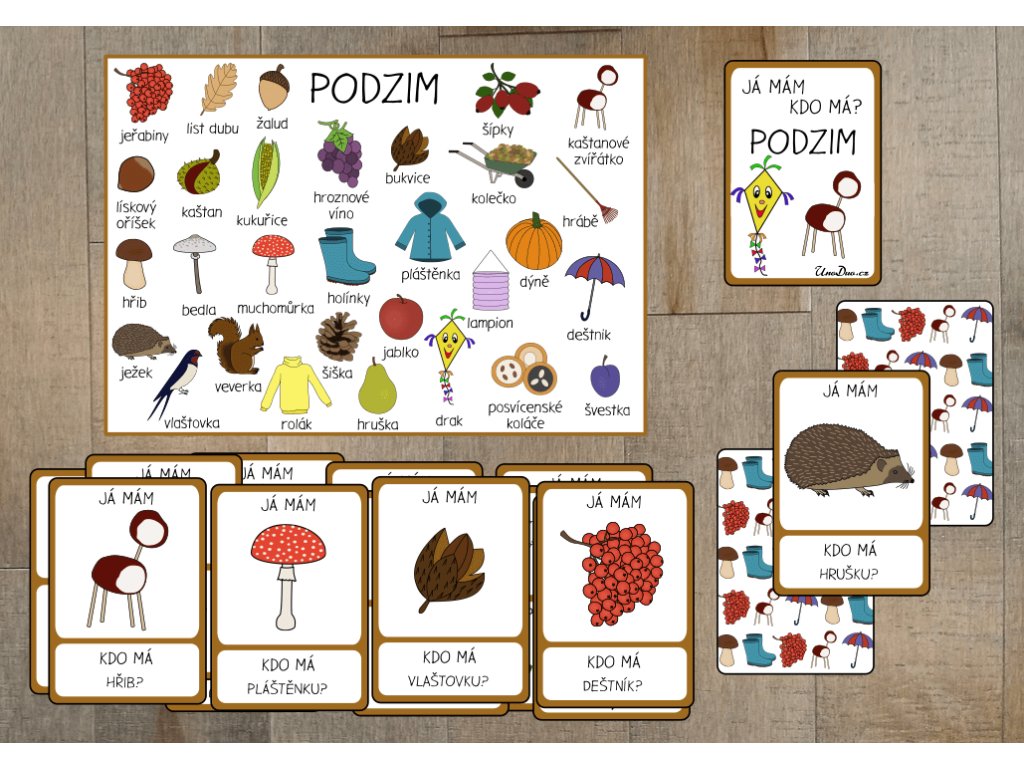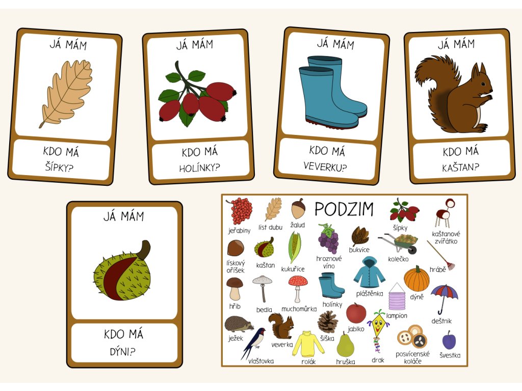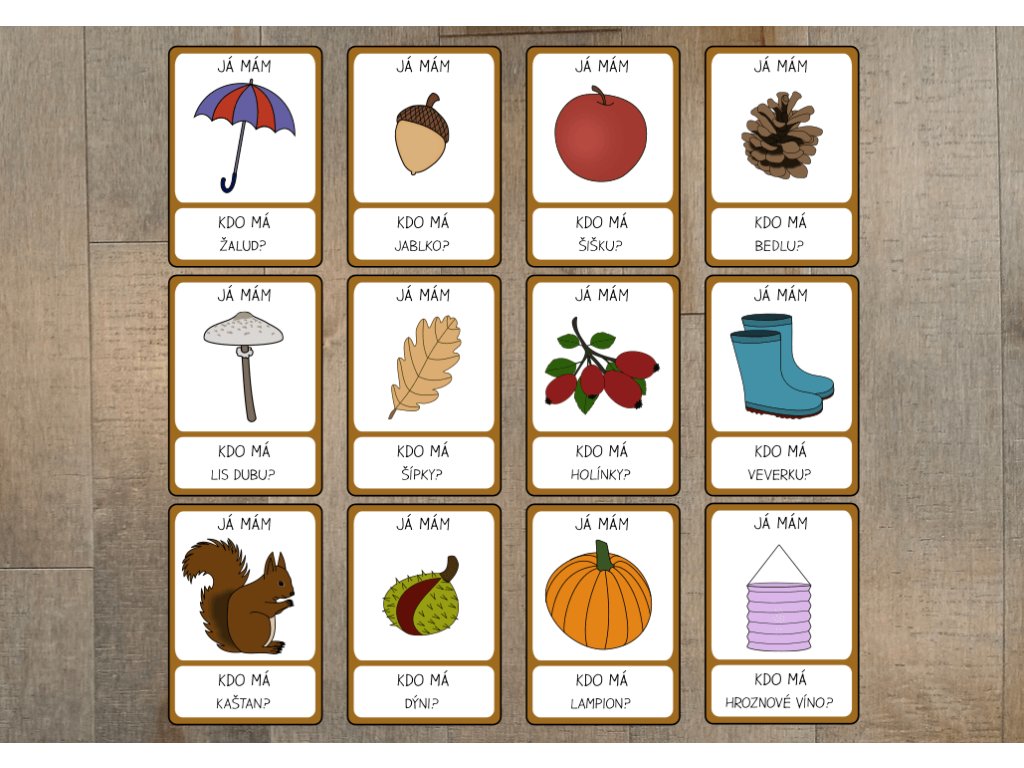 Rozdáme karty mezi děti (někdo může mít více). Zvolíme začínajícího hráče, který přečte spodní část libovolné karty - např. "Kdo má šípky?" Ozve se hráč, který má v horní části obrázek šípků "Já mám šípky" a zeptá se na obrázek ve spodní části své karty "Kdo má holínky?" Takto pokračujeme dále do doby, kdy se někdo zeptá na obrázek z horní části karty začínajícího hráče.