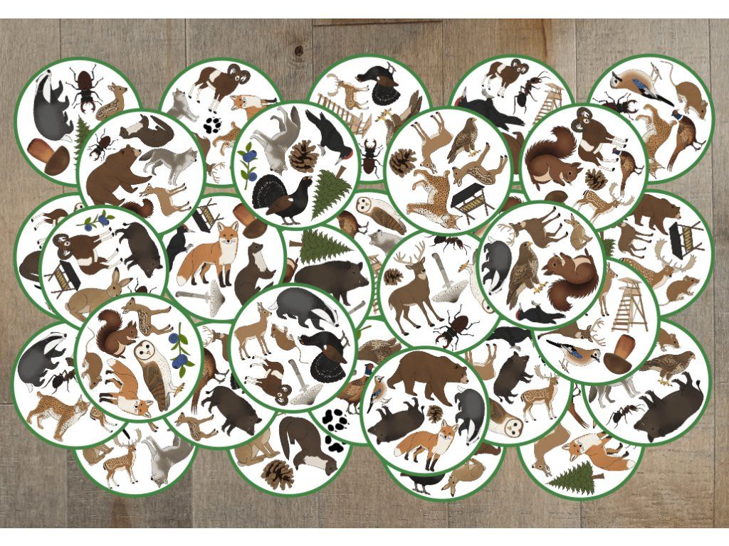 V sadě je 31 kulatých karet a přehledová kartička s názvy symbolů. Na každé kartě je šest různých obrázků a vždy dvě karty mají jeden obrázek stejný. Cílem je společný obrázek na dvou kartách co nejrychleji najít a pojmenovat.