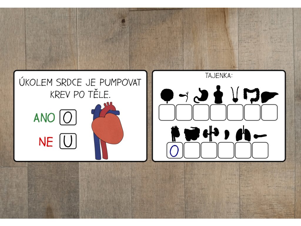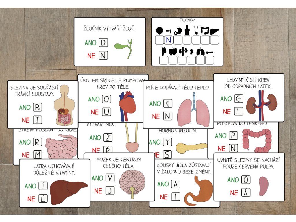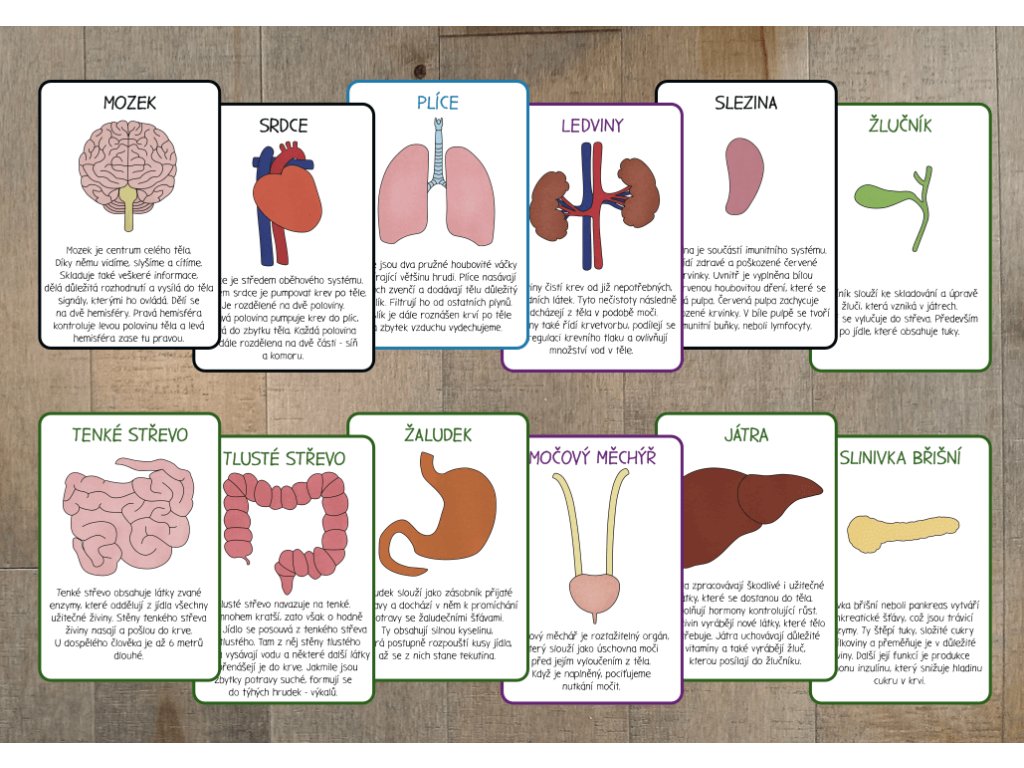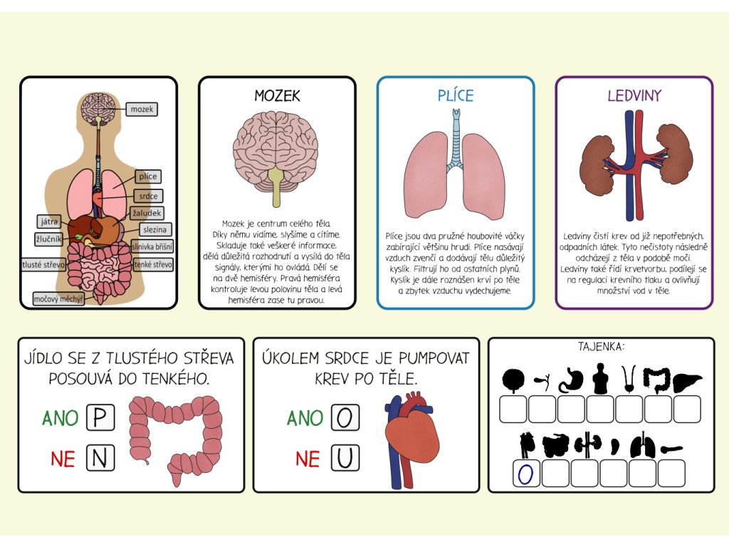 Aktivita zahrnuje 12 informačních karet, které přibližují hlavní orgány lidského těla. Od mozku a plic přes srdce a žaludek až po ledviny, močový měchýř, játra, slezinu, tenké a tlusté střevo, žlučník a slinivku břišní. Každá karta obsahuje stručný popis a vysvětlení funkce daného orgánu, díky čemuž si děti mohou snadno osvojit základní informace o tom, jak tělo pracuje a jak jednotlivé orgány přispívají k jeho správnému fungování.