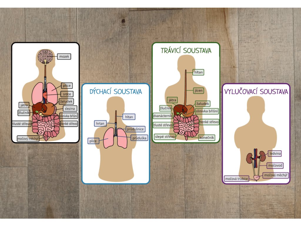 Součástí jsou také 4 přehledové karty, které znázorňují uspořádání hlavních orgánů v těle a poskytují stručný popis trávicí, vylučovací a dýchací soustavy. Tyto karty dětem umožňují získat ucelený přehled o jednotlivých tělesných systémech a jejich funkcích v organismu.