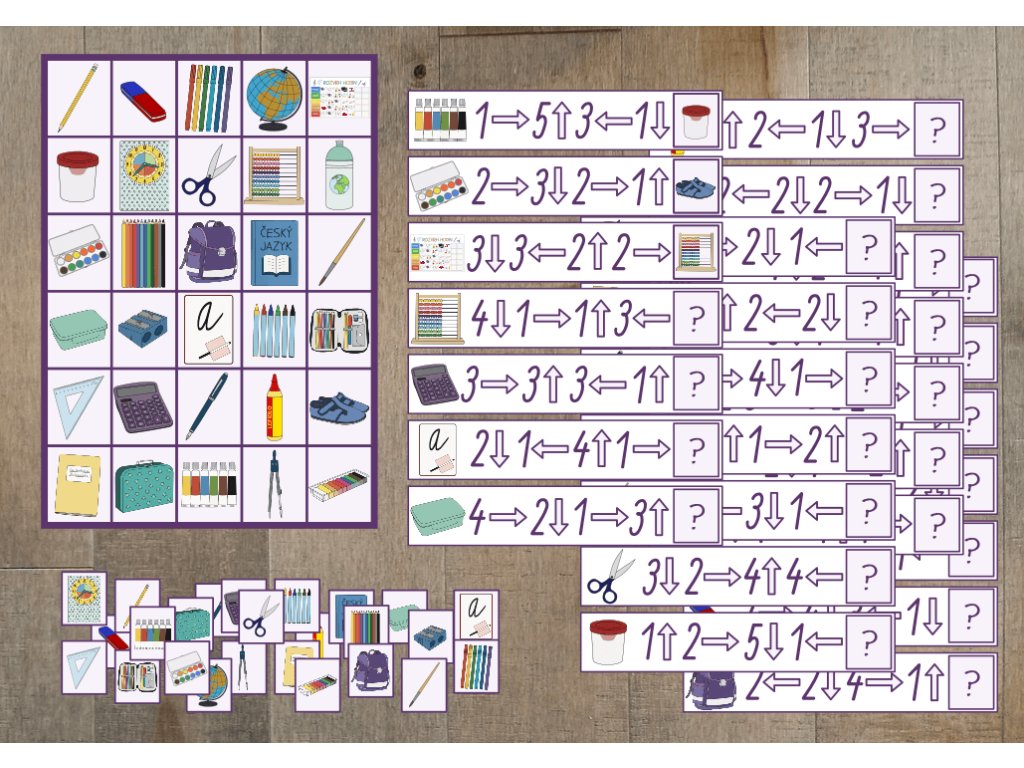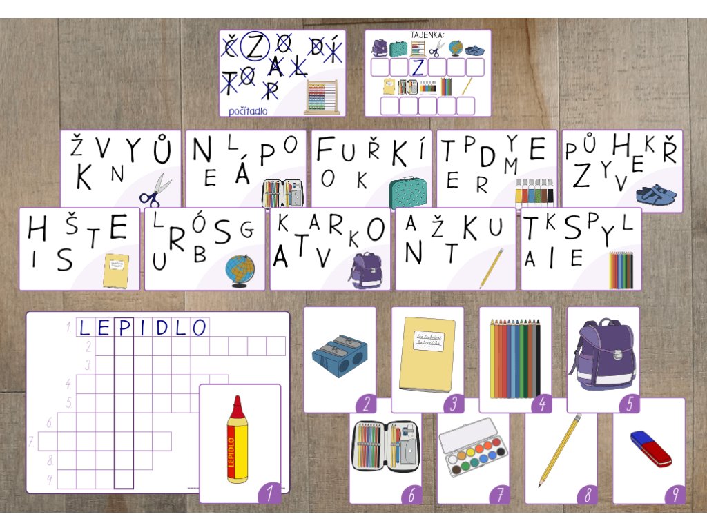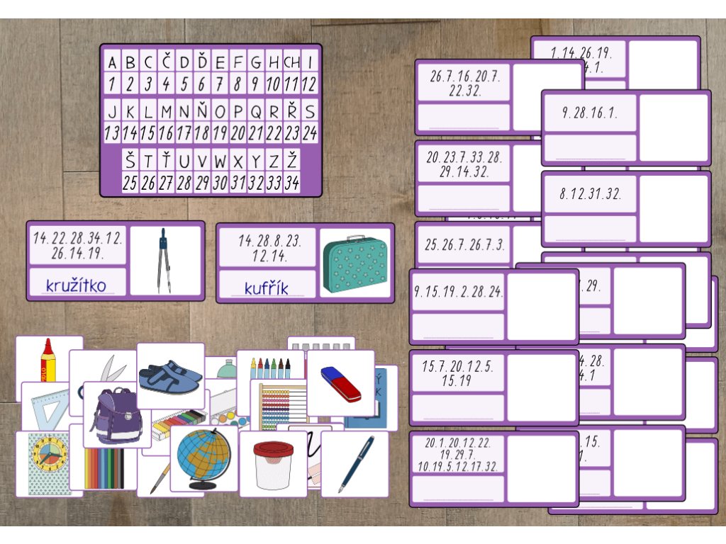 Aktivita obsahuje 24 karet s číselnou šifru názvu věci. Úkolem je vyluštit názvy a přiřadit obrázky.