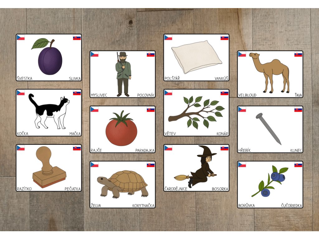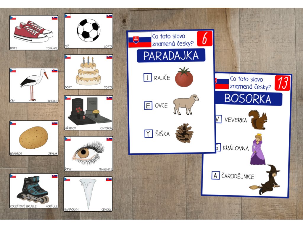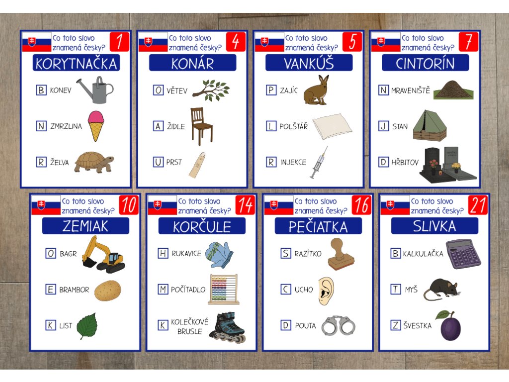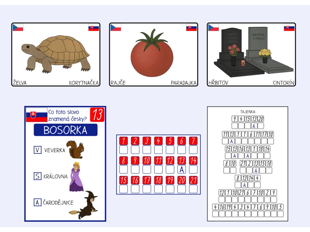 Šifrovací hra tematicky zaměřená na slovenská slova. Součástí jsou i obrázkové karty s českým překladem.