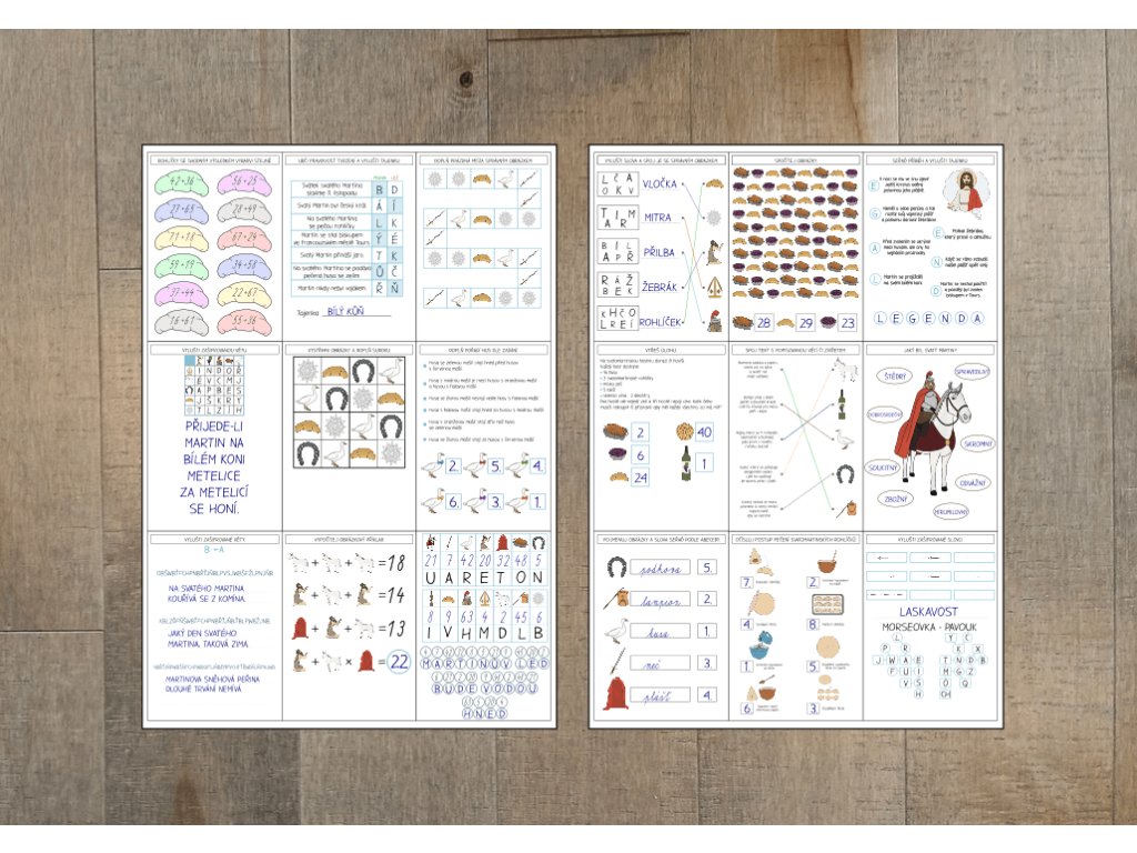 Pracovní listy tematicky zaměřené na svatého Martina přinášejí dětem možnost blíže poznat legendu o tomto světci a tradice, které se k jeho svátku pojí. Soubor obsahuje 20 různorodých úkolů, ve kterých děti čtou, počítají, luští šifry a řeší doplňovačky s tématem svatého Martina, hus a bílého koně.