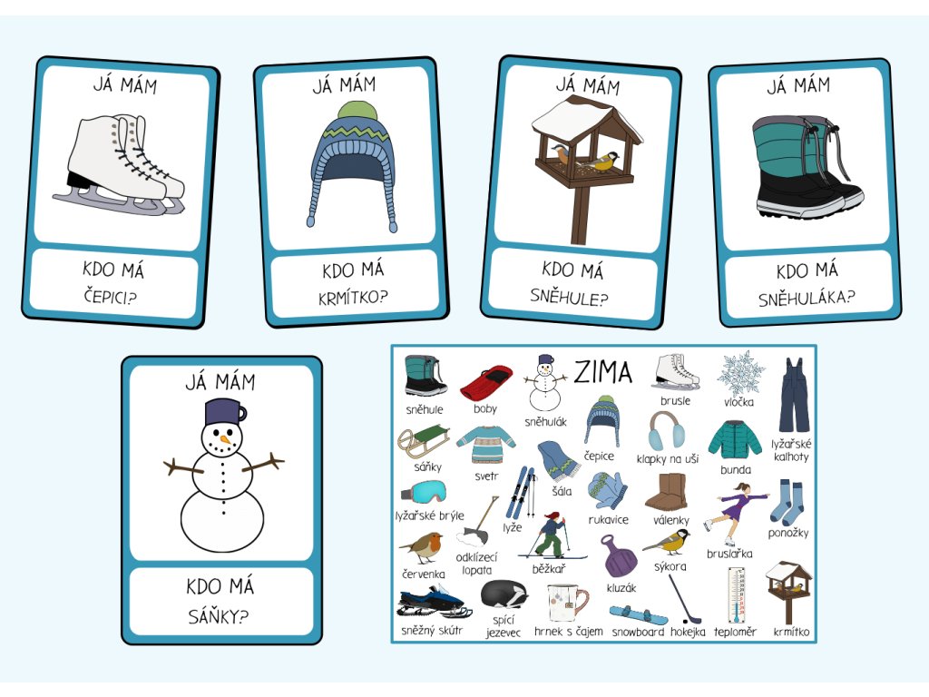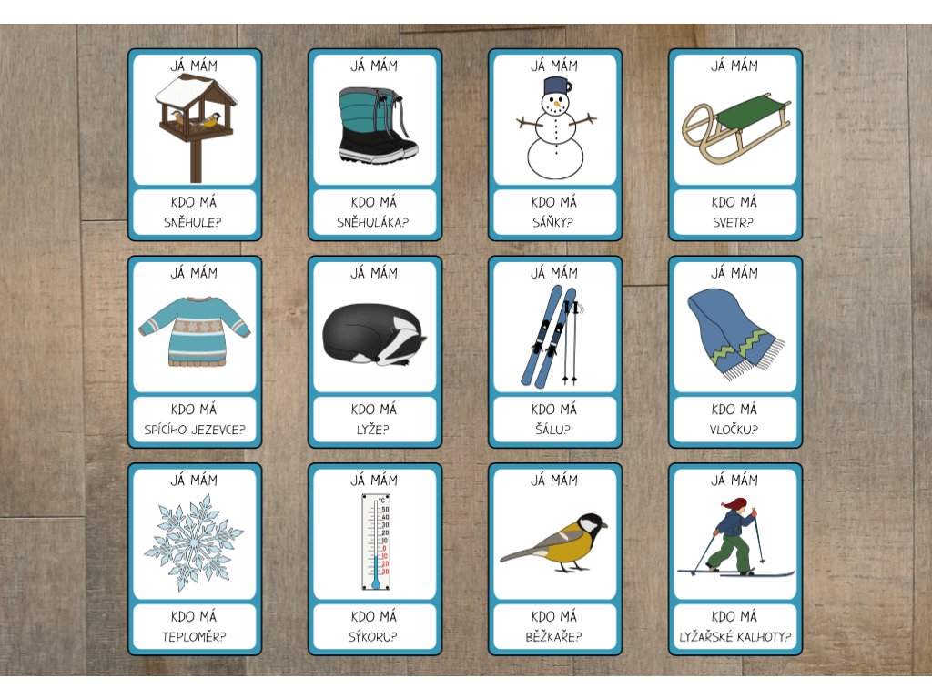 Rozdáme karty mezi děti (někdo může mít více). Zvolíme začínajícího hráče, který přečte spodní část libovolné karty - např. "Kdo má čepici?" Ozve se hráč, který má v horní části obrázek čepice "Já mám čepici" a zeptá se na obrázek ve spodní části své karty "Kdo má krmítko?" Takto pokračujeme dále do doby, kdy se někdo zeptá na obrázek z horní části karty začínajícího hráče.