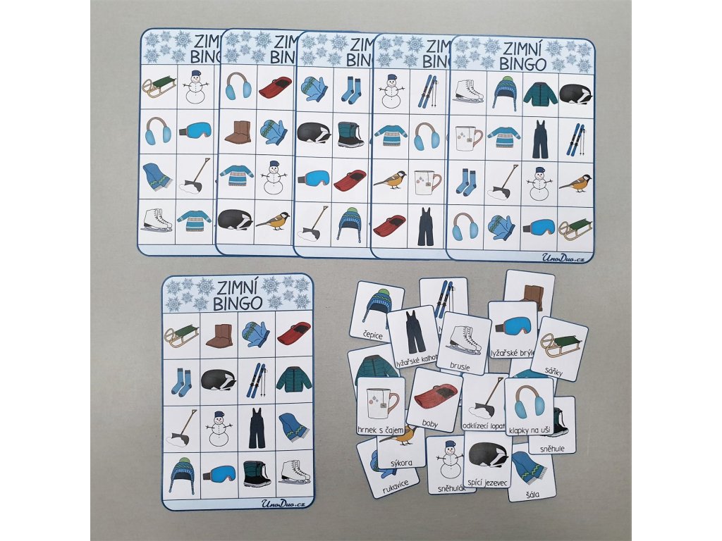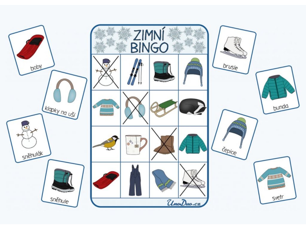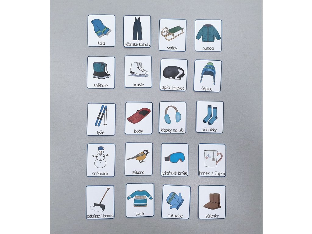 Aktivita obsahuje 6 karet s hrací tabulkou a 20 kartiček s obrázky se zimními motivy.