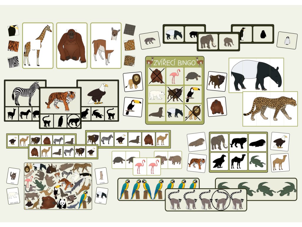 Sada 10 her a aktivit s obrázky zvířat ze zoo vhodná pro děti ve věku 2-4 roky.